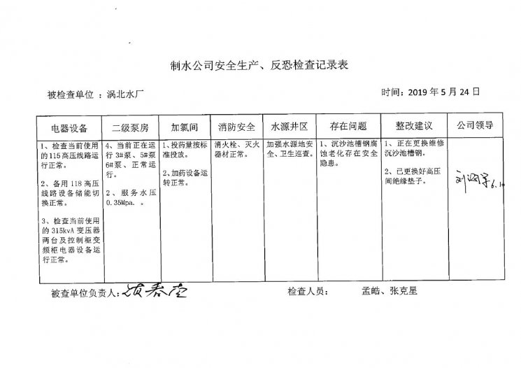 渦北水廠2019年5月安全生產(chǎn)檢查記錄