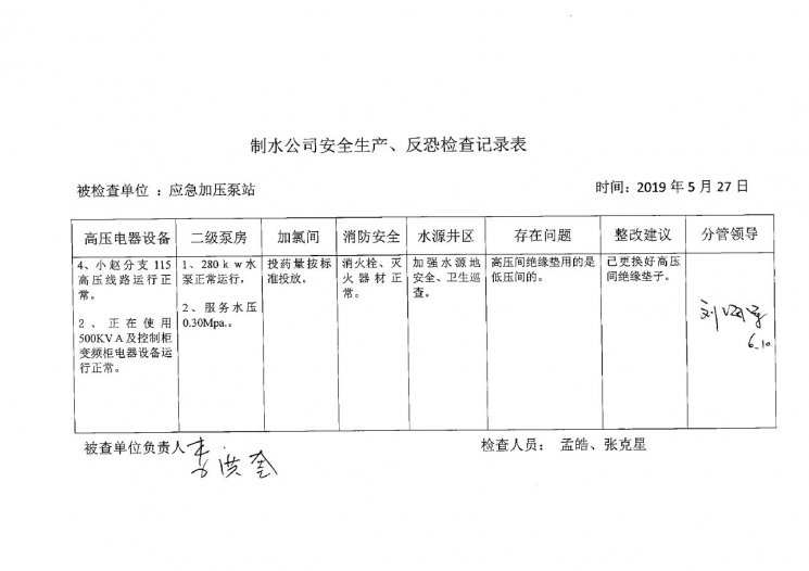 加壓泵站2019年5月安全生產(chǎn)檢查記錄