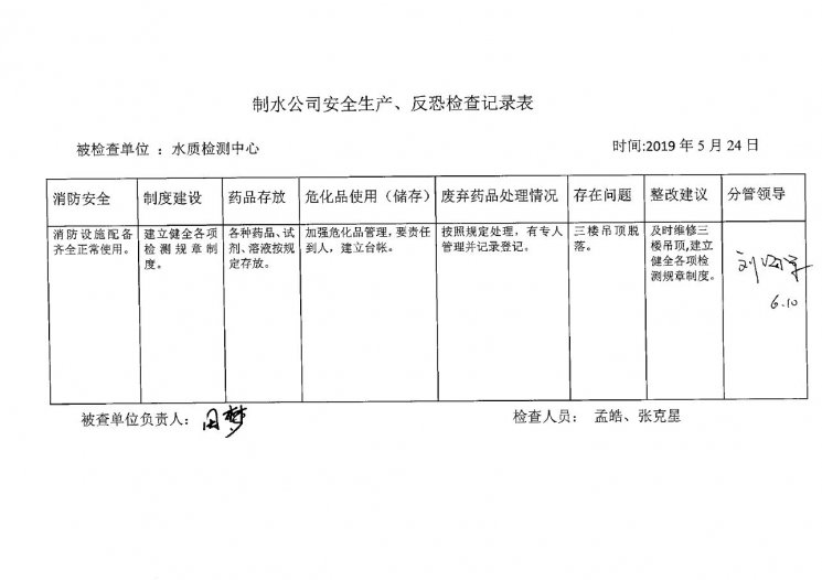 水質(zhì)檢測(cè)中心2019年5月安全生產(chǎn)檢查記錄
