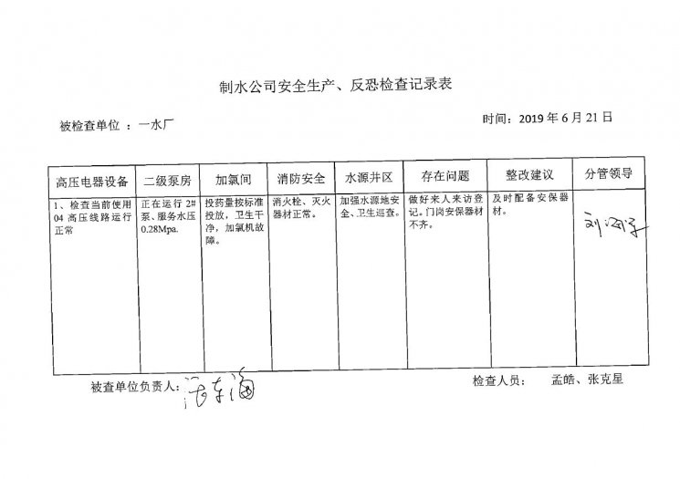 一水廠2019年6月安全生產(chǎn)檢查記錄