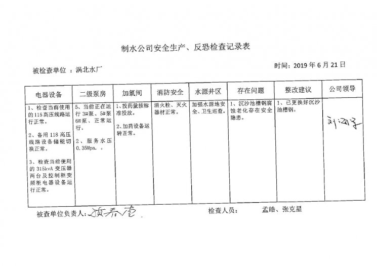渦北水廠2019年6月安全生產(chǎn)檢查記錄