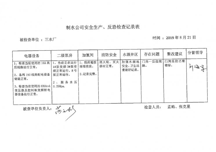 三水廠2019年8月安全生產(chǎn)檢查記錄