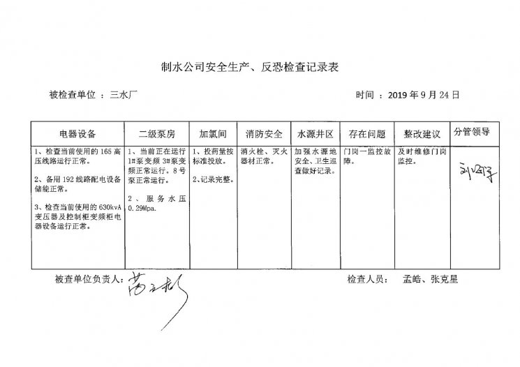 三水廠2019年9月安全生產(chǎn)檢查記錄