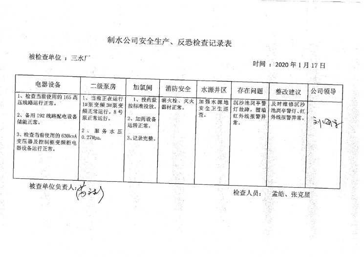 三水廠2020年1月安全生產(chǎn)檢查記錄