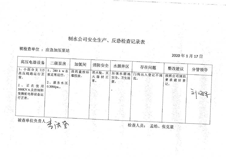 應急加壓泵站2020年1月安全生產(chǎn)檢查記錄