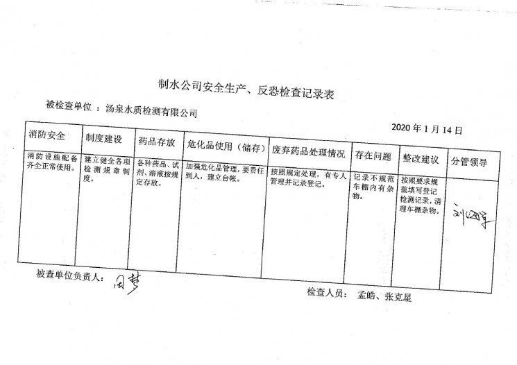 湯泉水質(zhì)檢測(cè)中心2020年1月安全生產(chǎn)檢查記錄