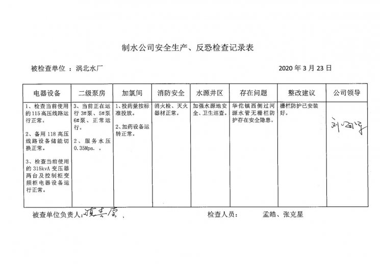 渦北水廠2020年3月安全生產(chǎn)檢查記錄