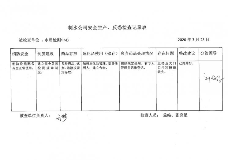 水質(zhì)檢測(cè)中心2020年3月安全生產(chǎn)檢查記錄