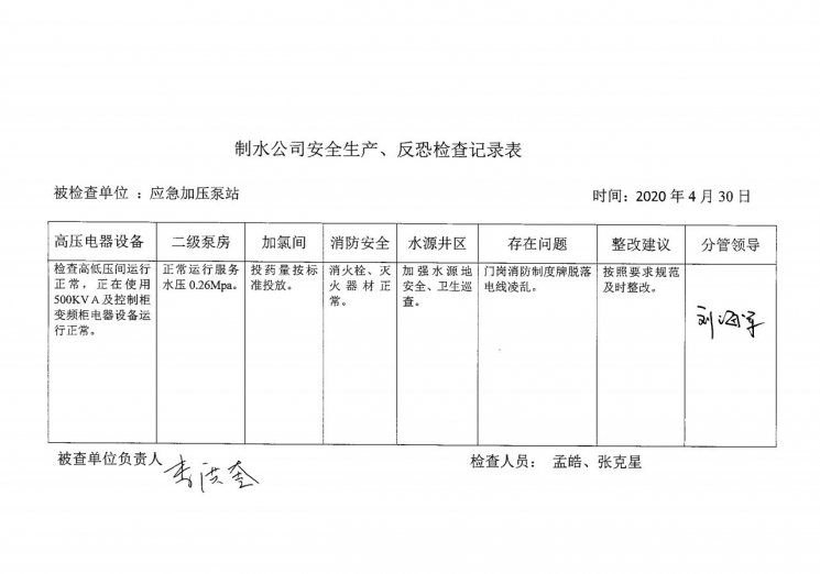 應急加壓泵站2020年4月安全生產(chǎn)檢查記錄