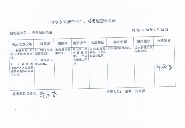 應急加壓泵站2020年6月安全生產(chǎn)檢查記錄