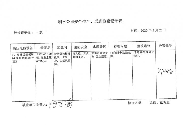 一水廠2020年5月安全生產(chǎn)檢查記錄