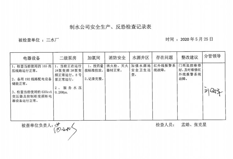 三水廠2020年5月安全生產(chǎn)檢查記錄