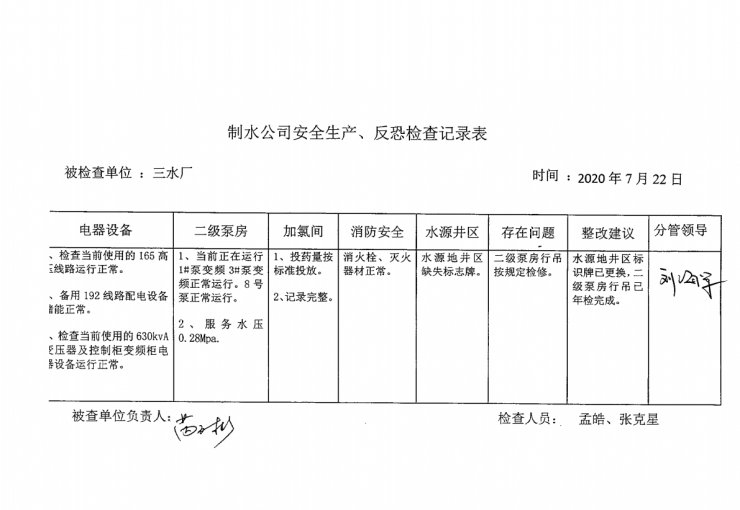 三水廠2020年7月安全生產(chǎn)檢查記錄