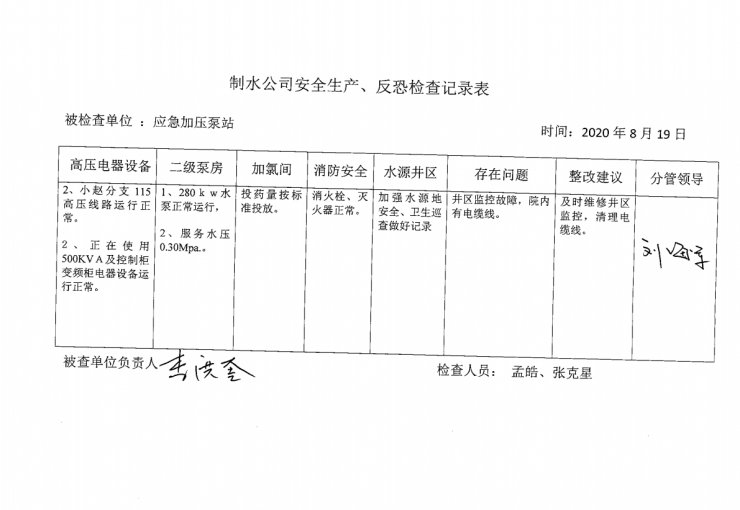 應急加壓泵站2020年8月安全生產(chǎn)檢查記錄