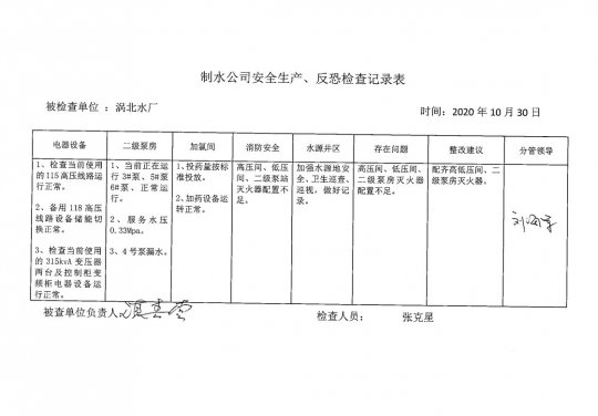 渦北水廠2020年10月安全生產(chǎn)檢查記錄