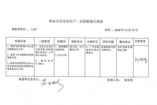 三水廠2020年10月安全生產(chǎn)檢查記錄