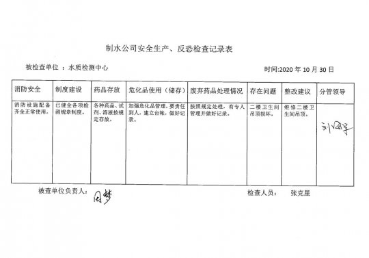 水質(zhì)檢測中心2020年10月安全生產(chǎn)檢查記錄