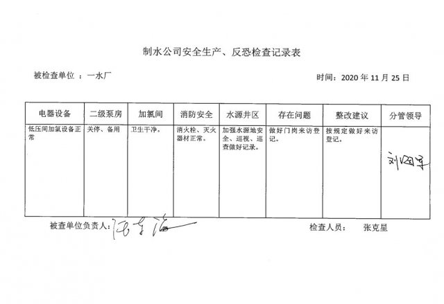 一水廠2020年11月安全生產(chǎn)檢查記錄