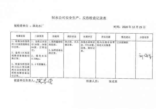 渦北水廠2020年12月安全生產(chǎn)檢查記錄