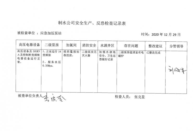 加壓泵站2020年12月安全生產(chǎn)檢查記錄