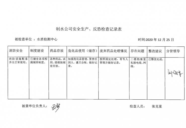 水質(zhì)檢測中心2020年12月安全生產(chǎn)檢查記錄
