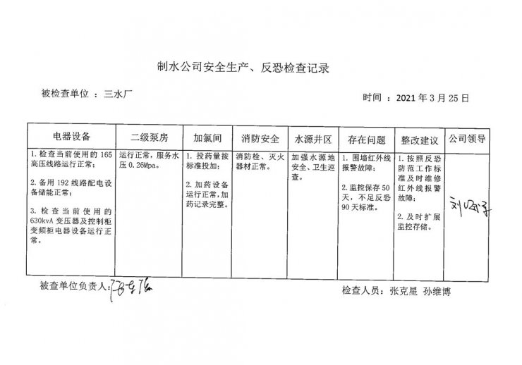 三水廠2021年3月安全生產(chǎn)檢查記錄