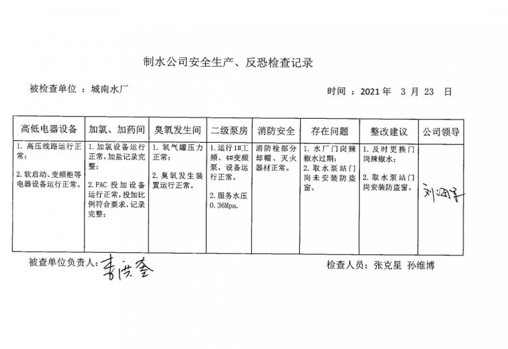 城南水廠2021年3月安全生產(chǎn)檢查記錄