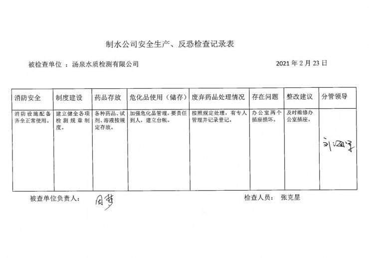 水質(zhì)檢測中心2021年2月安全生產(chǎn)檢查記錄