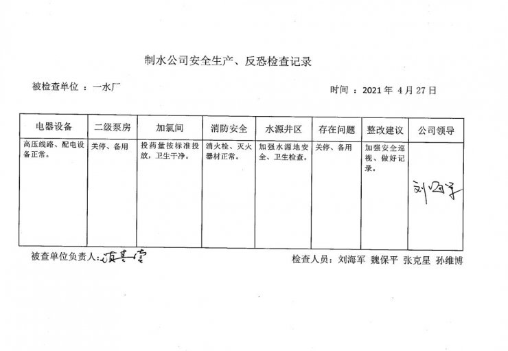 一水廠2021年4月安全生產(chǎn)檢查記錄