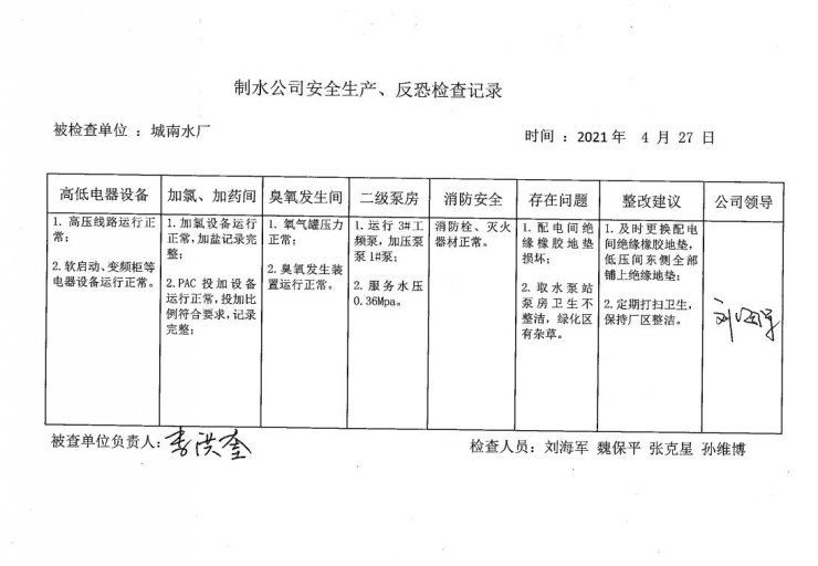 城南水廠2021年4月安全生產(chǎn)檢查記錄