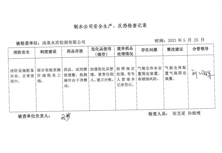 湯泉水質檢測中心2021年5月安全生產檢查記錄