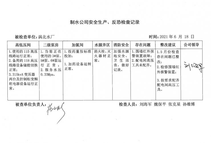 渦北水廠2021年6月安全生產(chǎn)檢查記錄