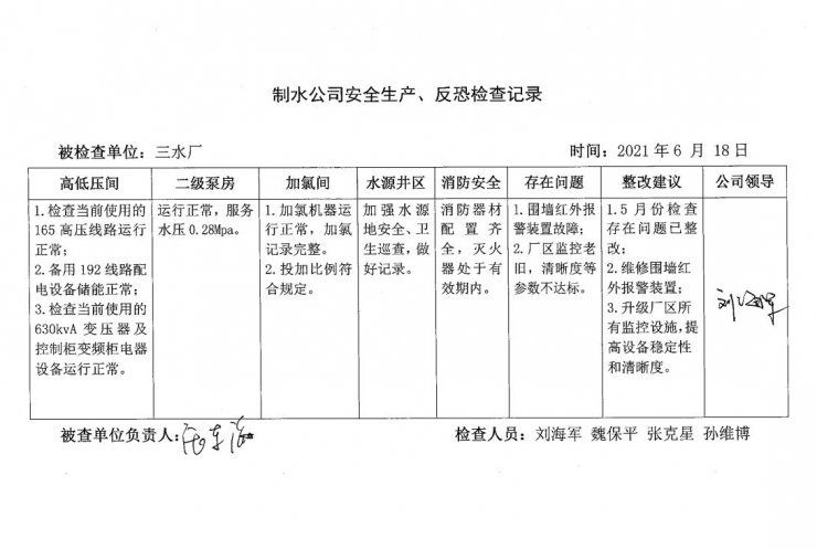 三水廠2021年6月安全生產(chǎn)檢查記錄