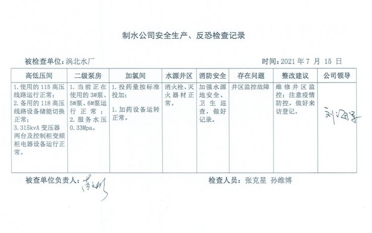 渦北水廠2021年7月安全生產(chǎn)檢查記錄