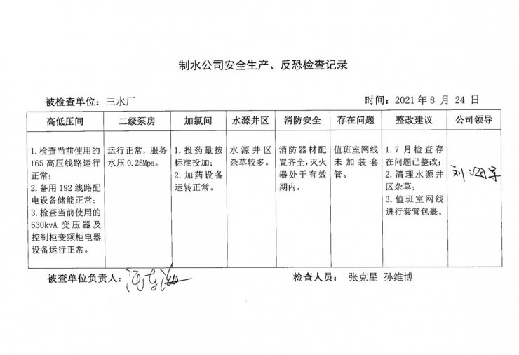 三水廠2021年8月安全生產(chǎn)檢查記錄