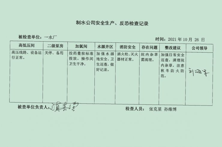 一水廠2021年10月安全生產(chǎn)檢查記錄
