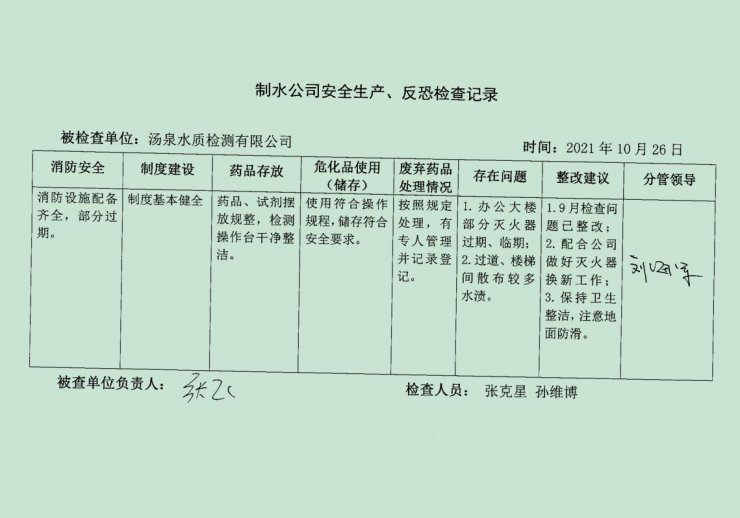 水質(zhì)檢測中心2021年10月安全生產(chǎn)檢查記錄