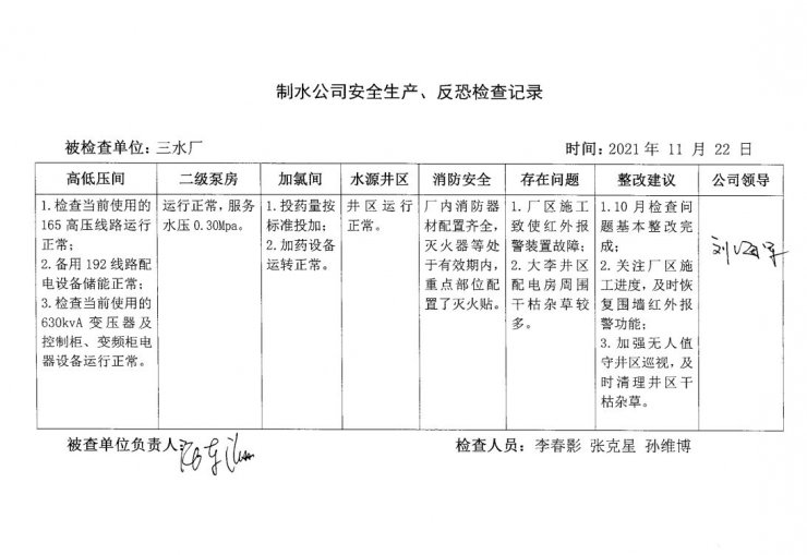 三水廠2021年11月安全生產(chǎn)檢查記錄