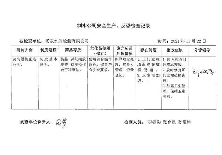 湯泉水質(zhì)檢測(cè)中心2021年11月安全生產(chǎn)檢查記錄