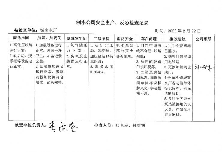 城南水廠2022年2月安全生產(chǎn)檢查記錄