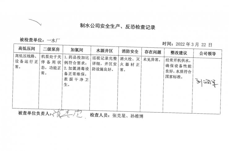 一水廠2022年3月安全生產(chǎn)檢查記錄
