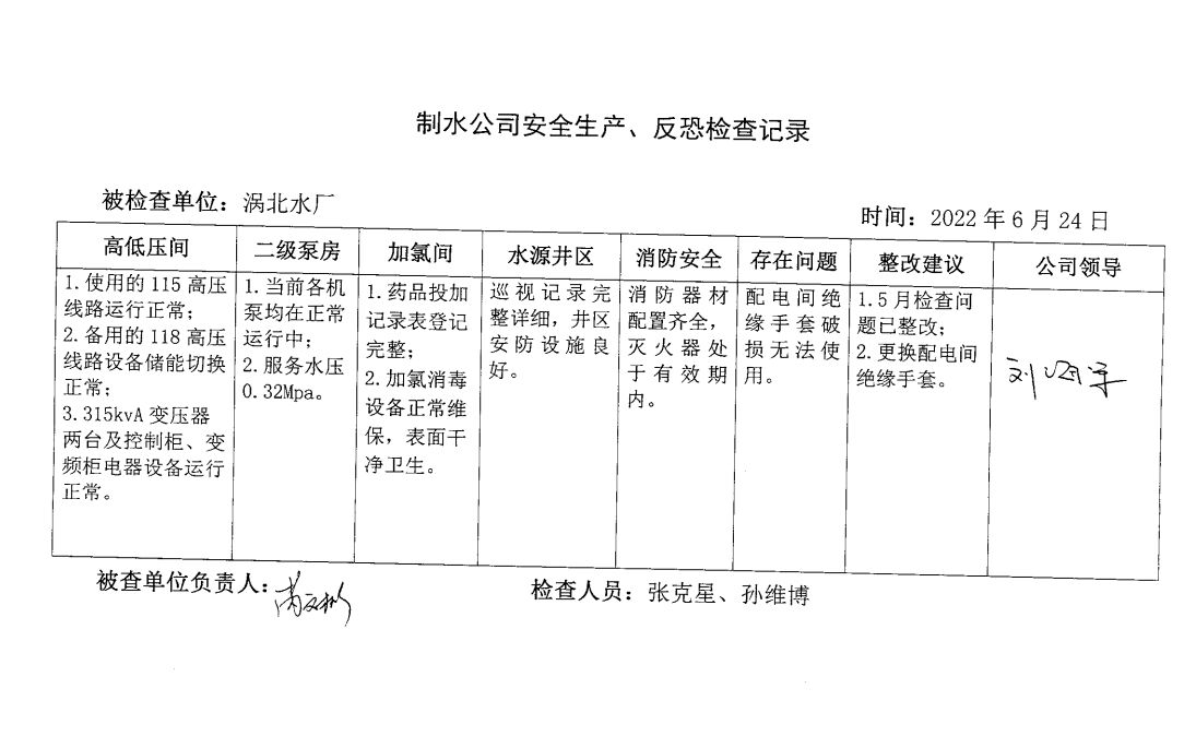 渦北水廠2022年6月安全生產(chǎn)檢查記錄