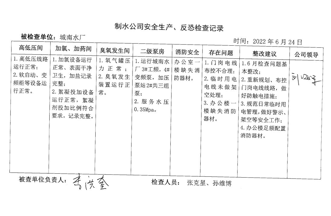 城南水廠2022年6月安全生產(chǎn)檢查記錄
