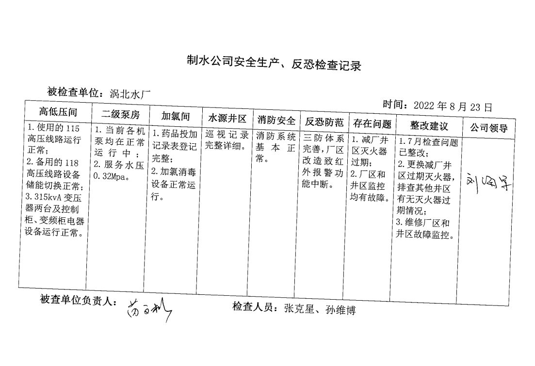 渦北水廠2022年8月安全生產(chǎn)檢查記錄