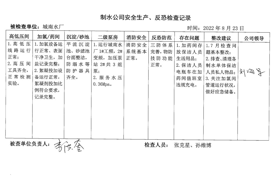 城南水廠(chǎng)2022年8月安全生產(chǎn)檢查記錄