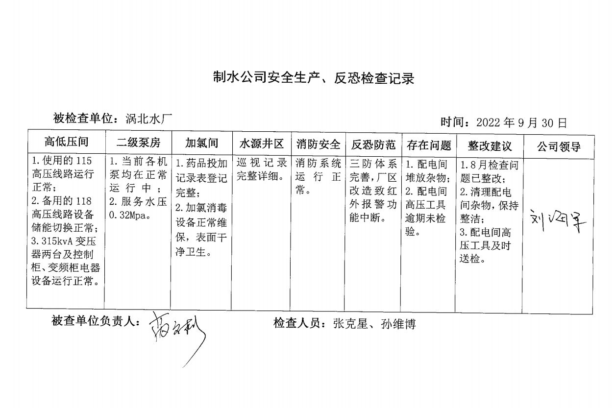 渦北水廠2022年9月安全生產(chǎn)檢查記錄