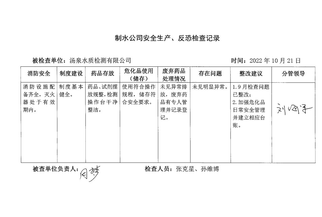 湯泉水質(zhì)檢測中心2022年10月安全生產(chǎn)檢查記錄