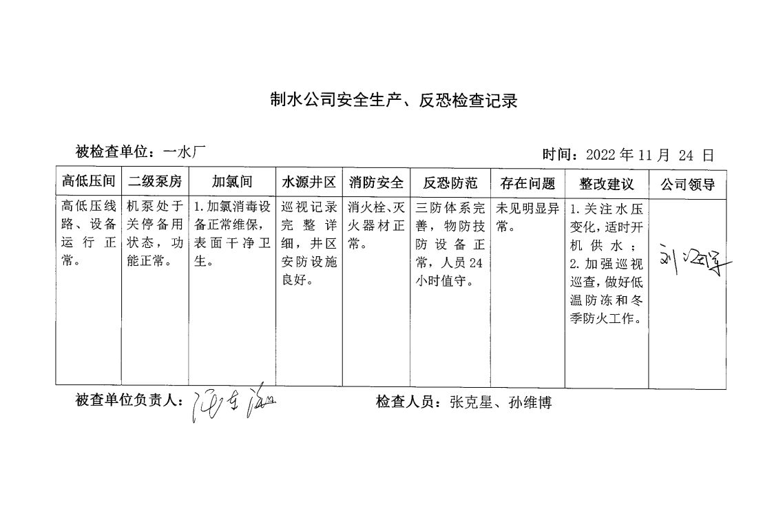 一水廠2022年11月安全生產(chǎn)檢查記錄