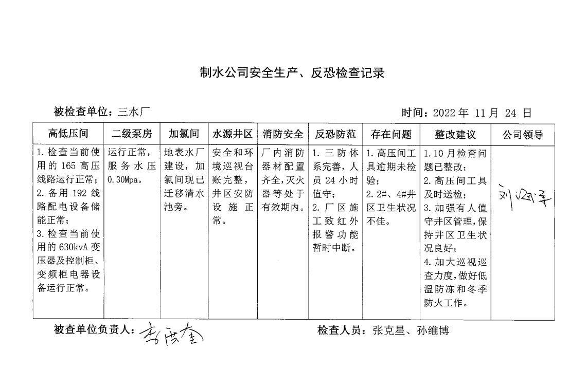 三水廠2022年11月安全生產(chǎn)檢查記錄