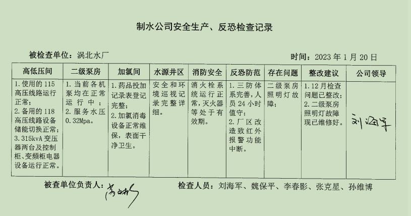 渦北水廠2023年1月安全生產(chǎn)檢查記錄